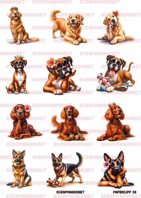 Papirklipp 38 - Golden retriver boxer irsk setter shæfer A4 19.00 NOK A4 ark med store gøyale motiv som vist. 250gr. Legg i handlekurv Lagerbalanse: 21 Del Informasjon Tilbakemeldinger A4 ark med store gøyale motiv som vist. 250gr.